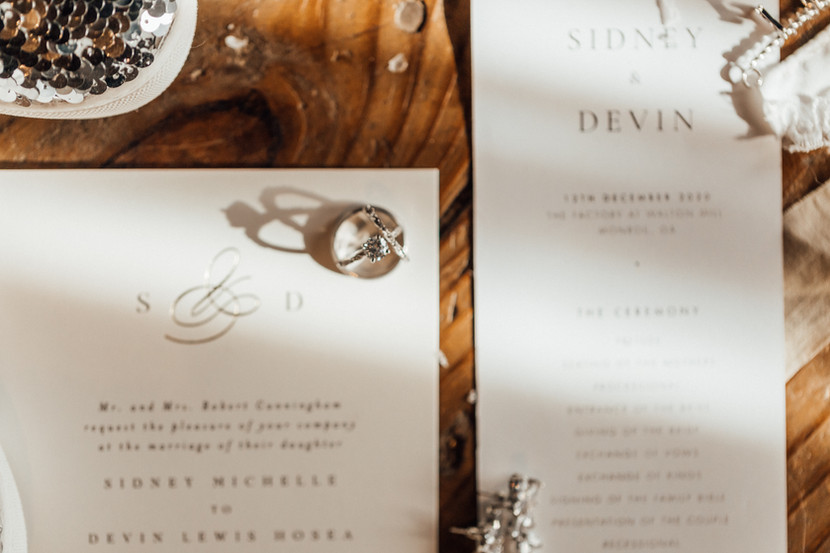 Since Covid came to town a few weeks after Sidney & Devin booked us, we did most of our initial meetings over Zoom, but that didn’t stop the planning! At one point, Sidney looked at us through the lens and said “I’m marrying Devin on December 12th, no matter how many people can be there.” We loved how ready they were just to be with each other! Once covid calmed down a bit, we met with them at their venue for Open House since it was brand new. A few weeks later, we met them at Devin’s house to go over details, make a floor plan, & eat yummy pizza. We had one final walk-through a month before the wedding with Jeff who is the venue manager of The Factory of Walton Mill & florist from JL Designs along with Melinda from White Tiger. We were so ready to get Sidney & Devin married!