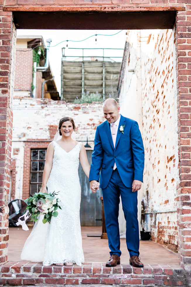 As the ceremony wrapped up, guests were invited to a cocktail hour while Taylor & Nick had photo time! The guests enjoying cocktail hour were greeted by music, wine, and some AC (we as we all know how essential this is in Georgia summers!). The sheer draped fabric that Taylor had the Engine Room put up really defined the space and painted a soft romantic feel for the rest of the evening! In the meantime, Chris and Jonathan, the lovely photography team, took Taylor and Nick off site to a railroad track nearby for photos! This was something we found so unique (just look at the pictures and we think you’ll agree)!